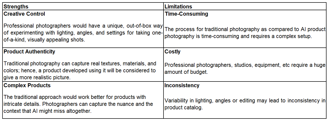 Though AI product photography has many advantages, traditional methods show great value, specifically in certain contexts.